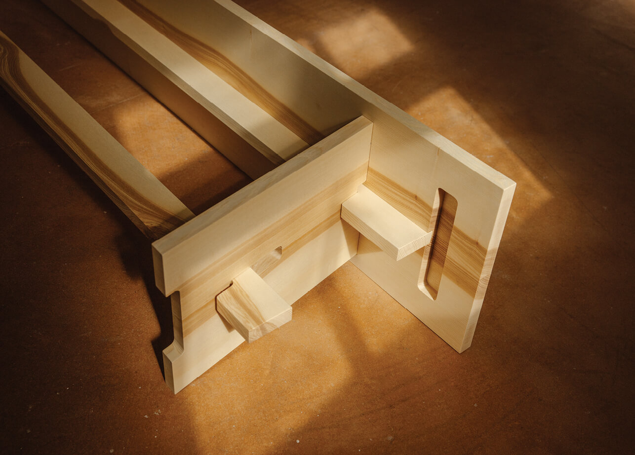Durch die Entwicklung einer raffinierten Steckverbindung entsteht eine Symbiose zwischen Ästhetik und Funktion. Schrauben oder sonstige Verbindungselemente werden durch die patentierte und technische Verbindung obsolet. Die patentierten Möbelstücke werden in der Zusammenarbeit mit lokalen, innovativen Schreinern produziert. Vom Holzschlag bis zum Endprodukt wird die Wertschöpfung so in der Schweiz gehalten, insbesondere in den Bergregionen.